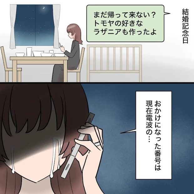 「まだ帰って来ない?トモヤの好きなラザニアも作ったよ」とメッセージを送っても返信はなく、電話してみたのですが、「おかけになった番号は現在電波の・・」とメッセージが流れるだけで、トモヤが電話に出ることはありませんでした。