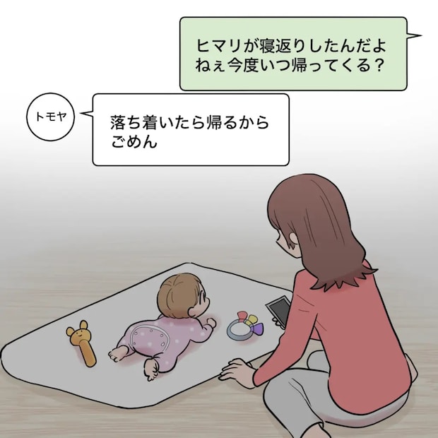 「ヒマリが寝返りしたんだよ。ねぇ今度いつ帰ってくる?」全く帰って来ないトモヤにヒマリの成長を伝えると、「落ち着いたら帰るから。ごめん」と返信があっただけ。ヒマリの成長を見守るのは私だけでした。