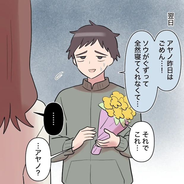「アヤノ昨日はごめん・・!ソウがぐずって全然寝てくれてなくて・・」そう言いながら手に持っている花束を差し出し、「それでこれ・・」と言われるも何も言う気はおきず無言に。「・・アヤノ?」と申し訳なさそうにトモヤが私を呼んだのでした。