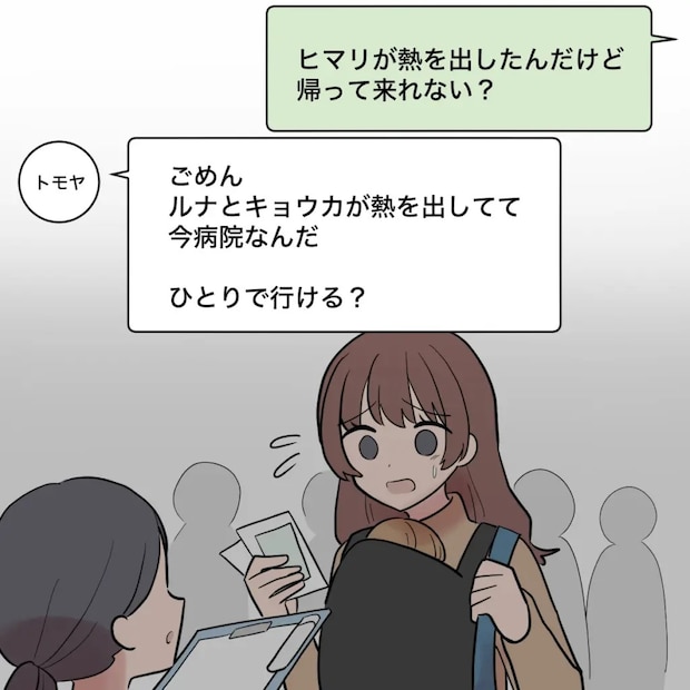 「ヒマリが熱を出したんだけど帰って来れない?」なかなか帰って来ないトモヤに連絡すると、「ごめん。ルナとキョウカが熱を出してて今病院なんだ。ひとりで行ける?」と返信が。熱が出たヒマリを心配しながらなんとかひとりで病院に行きました。