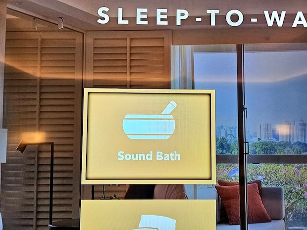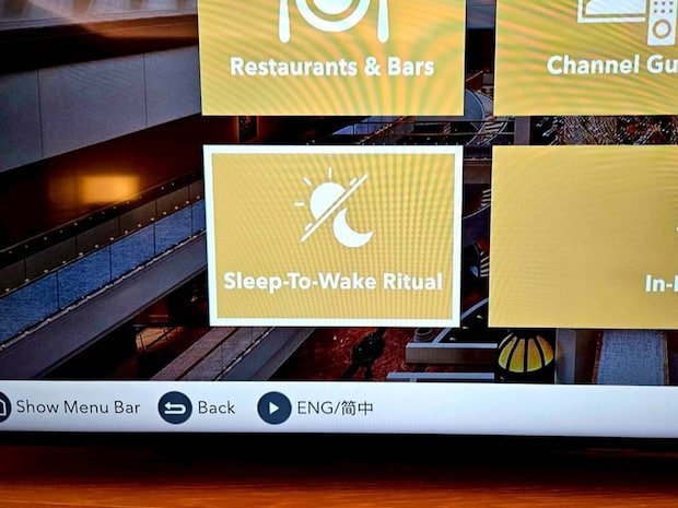 なんじゃこれはとテレビ画面を操作すると、ホテルの案内画面のド頭に『SLEEP-TO-WAKE RITUAL』というメニューが表示されていることに気づきました。英語が堪能ではないのですが、睡眠と起床に関する何かであることは、アホな私でもわかります。なんだろうねこれは……。