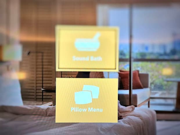 選択すると今度は「Sound Bath」と「Pillow Menu」の文字が。ピローメニューのほうは写真を細かく撮り忘れたのですが、要するに「枕、合ってる? ダイジョブ? そもそもいくつか種類を用意しておいたんだけどさ、もし合わなかったら合うまで変えてあげるから、言ってね。なにがなんでもあると思うの、うち!」的なアツいメッセージ。