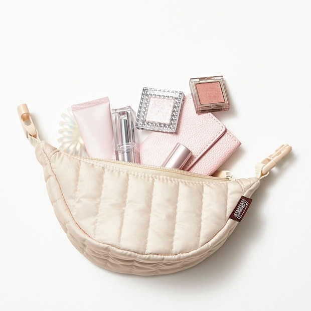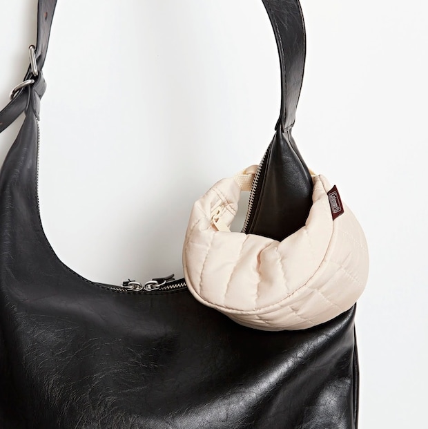 ダウン調生地のボリューミーなクロワッサンポーチはしっかりマチがあるので見た目以上の収納力◎。コスメやお出かけに必須なアイテムもしっかり入る!