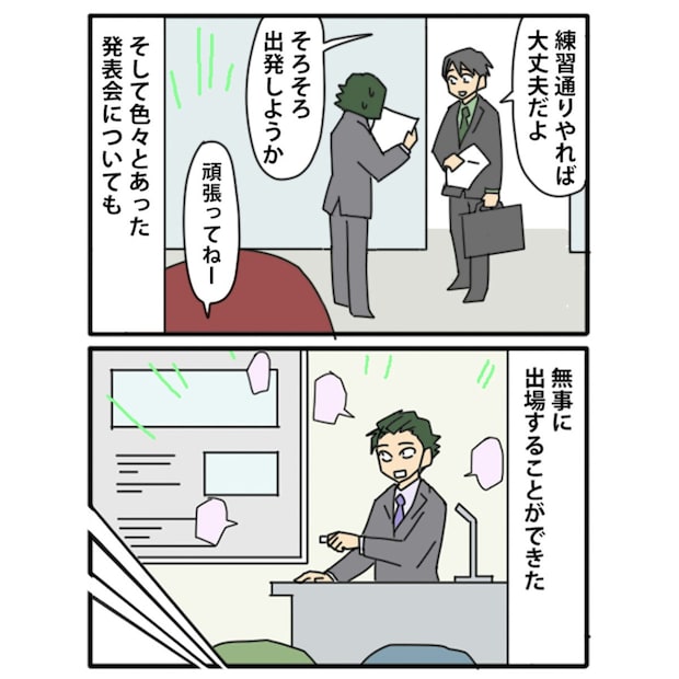 それから3か月が経過し、カモちもさんの同僚と先輩さんは、予定通り発表会へと赴きます。支社の代表として、無事に出場を果たしました。
