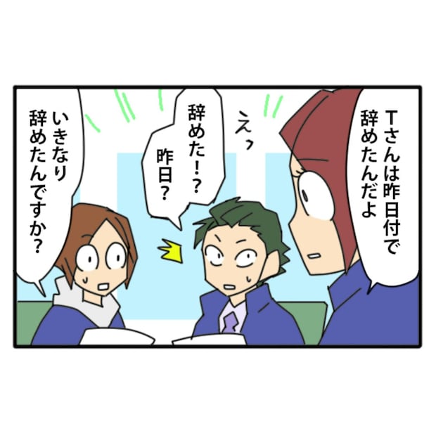 課長からきびしく注意されてからは、大きな問題もありませんでした。発表会も同僚社員が無事に務めを果たしました。そんな矢先、Tさんが「昨日付で退職した」と知らされ、カモちもさんはおどろきます。一体、Tさんに何があったのでしょうか?