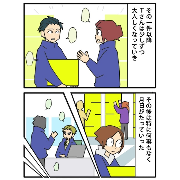 自分のミスを人のせいにするなどの、自分本位な行動をくり返していたTさん。課長に本気で注意を受け、その後はおとなしく仕事をこなし、職場では何事もなく日々が過ぎて行きました。