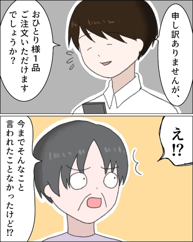 すると、「申し訳ありませんが、おひとり様1品ご注文いただけますでしょうか?」店員さんにそう言われ、「え!?」と驚いた母が「今までそんなこと言われたことなかったけど!?」と怪訝な顔でたずねると、