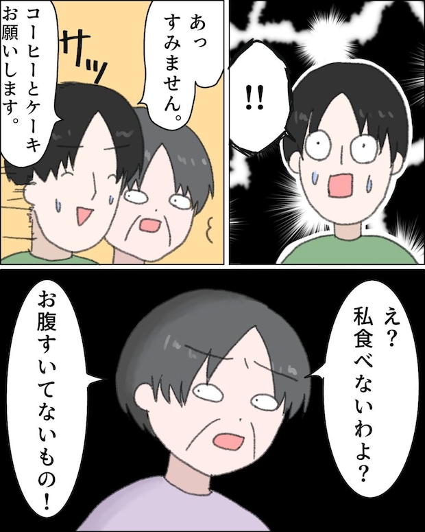 母の言葉を聞いて驚いた兄が「!!あっすみません。コーヒーとケーキお願いします」と横から口を出しました。母は「え?私食べないわよ?お腹すいてないもの!」と平然と言い放ち、