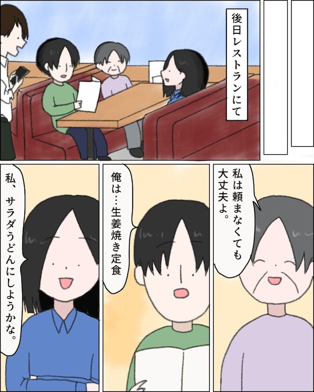 「私は頼まなくても大丈夫よ」といつものように言う義母。すると、「俺は・・生姜焼き定食」と頼む兄。「私、サラダうどんにしようかな」とオーダーしました。