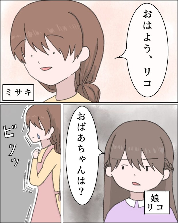 しばらくして同居の義母が起きてくると、パッと明るい笑顔になったリコが義母に「おはよう」と飛びつきます。義母も笑顔。こんな幸せそうな2人を目の前にして、私は心がズキズキします。