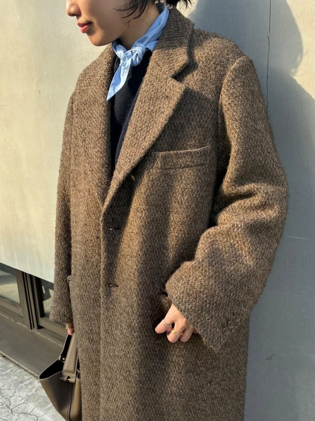「インポートファブリックならではの風合いが際立つ、トレンドムード漂うチェスターコートのスタイリング。ニュアンスの効いたブラウンにあえて鮮やかなブルーシャツを差し色としてプラスすることで、クラシックなコートから覗くカラーリングに軽さと洒落感を演出しました。落ち着きのある配色の中にさり気なく旬を感じさせるスタイルにしたのもポイントです」