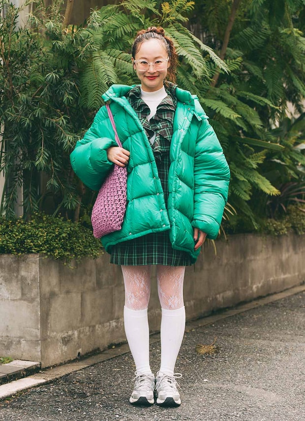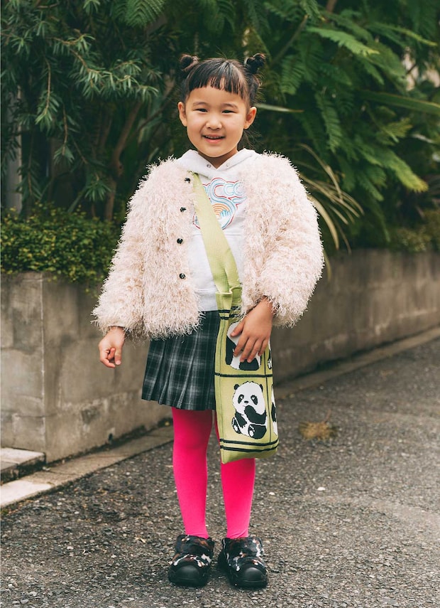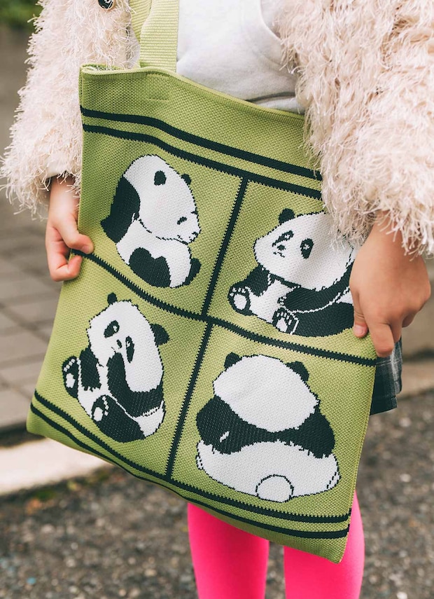 愛くるしいパンダが並ぶニットバッグは中国のお土産のもの。ほんのりしたグリーンイエローがコーデが目を引く主役級アイテム。