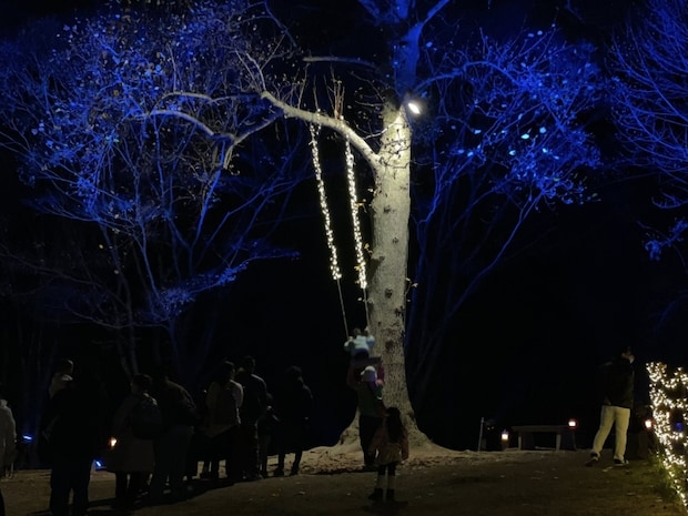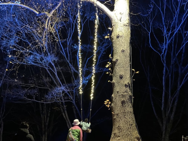 丘の上の木に吊り下げられたブランコには電飾が施されていて、乗っている人はもちろんのこと、周囲の人の目も楽しませてくれます。