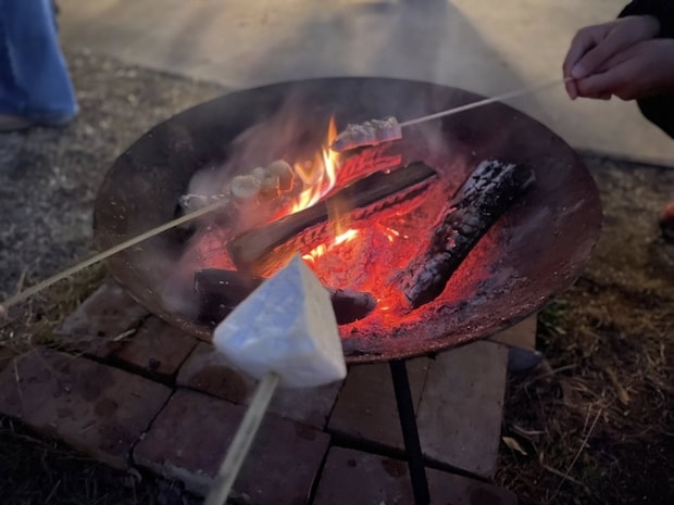 レストラン横のスペースにいくつもの焚き火が設置されていて、マシュマロや自家製ベーコンなどの、焚火メニューが豊富に取り揃えられています。