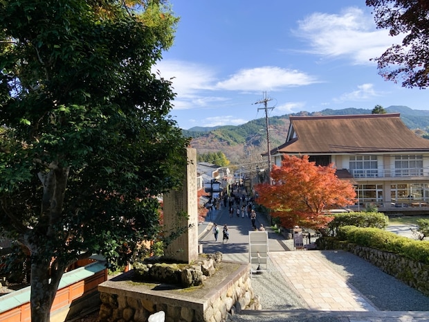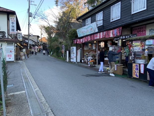山の尾根を通る参道沿いには、奈良の郷土料理「柿の葉寿司」、鮎の塩焼き、和菓子などを販売するお店が軒を連ねており、街歩きが楽しめます。新しいカフェや日帰り入浴施設もオープンしているので、訪れるたびに発見があるかもしれませんね。