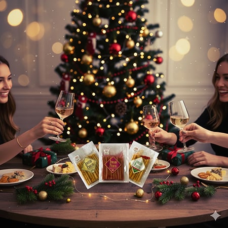 今年はケーキなどの定番スイーツに加えて、ヘルシーなおつまみを取り入れてみては。ジュエルドピクルスなら、気軽につまめて罪悪感もない。ワインとの相性も抜群で、前菜としてはもちろん、フィンガーフードとしてそのままつまんでも楽しめる“おしゃれなキラキラピクルス”になっている。