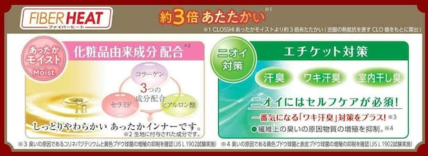 その中でもFIBER HEAT SUPER PREMIUM「あったかモイスト」インナーは、従来のCLOSSHI FIBER HEAT「あったかモイスト」と比較して約3倍の保温力を実現した製品。