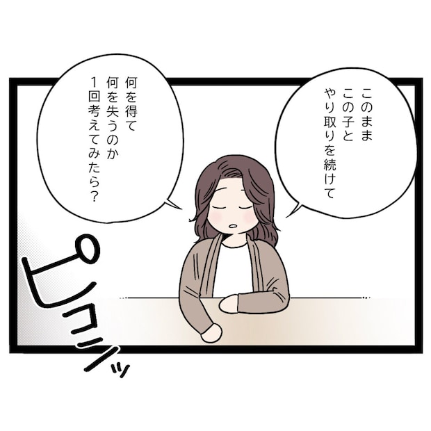 「このままこの子とやり取りを続けて、何を得て何を失うのか1回考えてみたら?」目の前のレイ子しか見えていないまさひでに、本当に大切にすべきなのは何かを問いかけました。するとその瞬間、まさひでのスマホに1件のメッセージが届きました。