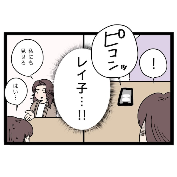 仕事一筋の雅美さんの楽しみは、弟まさひでさんと義妹ゆかさん夫婦の長男たっくんを可愛がること。ある日、仲良くしているゆかさんに誘われてたっくんに会いに行くと、ゆかさんの元気がないことに気付きました。帰り道の途中、心配になった雅美さんが「大丈夫?」とメッセージを送ると「まさひでさんが浮気してるかも」と目を疑う返信が。真相を探るため、すぐにまさひでさんを食事に誘う雅美さん。問い詰めると、相手は同じ職場で働く派遣社員のレイ子さんという人で、まさひでさんに特別な感情はなく、あくまでも部下と上司の関係で相談に乗っていると言います。しかし雅美さん視点では、とても仕事とは言えないやり取りをしていて、不安になる一方。それから1か月後、ゆかさんのタレコミで、まさひでさんとレイ子さんは2人で食事に行くような仲に発展したと聞き、雅美さんはびっくり。まさひでさんを呼び出して問い詰めると、なんと名前で呼び合う仲になっていました。雅美さんは思い切ってまさひでさんのスマホを取り上げると、2人の気持ち悪いやり取りがじゃんじゃん出てきて顔面蒼白。いつまでも浮かれているまさひでさんに、雅美さんは「世の中には幸せそうな家庭を壊すのが好きな女がいる」とレイ子さんの本性を突き付けたのでした。
