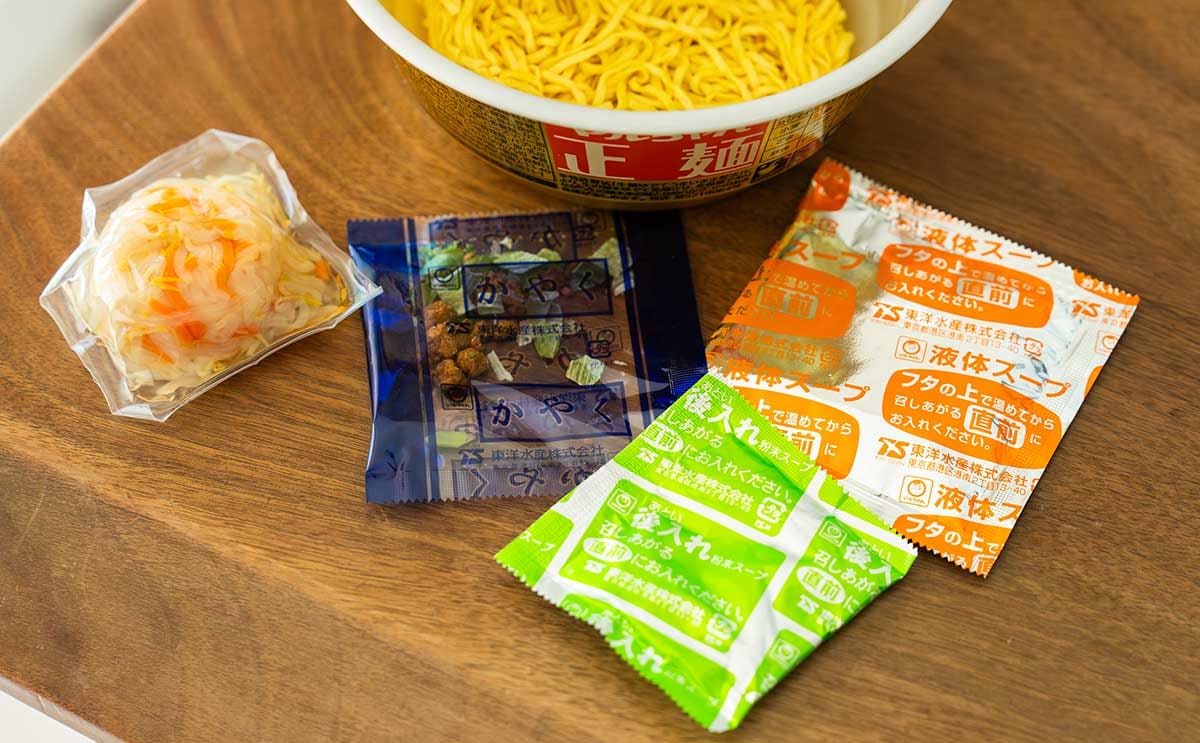 カップの中には、麺の他に「もやし調理品(もやし・にんじん)」と「かやく」「後入れ粉末スープ」「液体スープ」の袋が入っています。