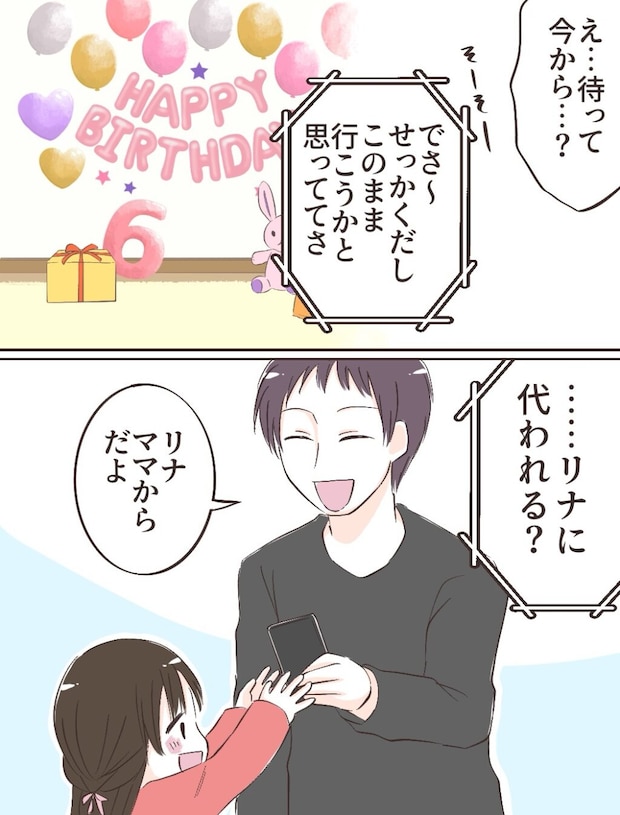 「え・・・待って、今から?」私は飾り付けた部屋に目を向けます。せっかく準備したのに、今からテーマパークなんて行ったらお誕生日会ができなくなってしまう・・・。しかし、タイキはそんな私の心情も知らず「でさ、せっかくだしこのまま行こうかと思っててさ」と言いました。私は、リナがどうしたいのかを本人の口から聞くために、電話を代わってもらうことにしました。