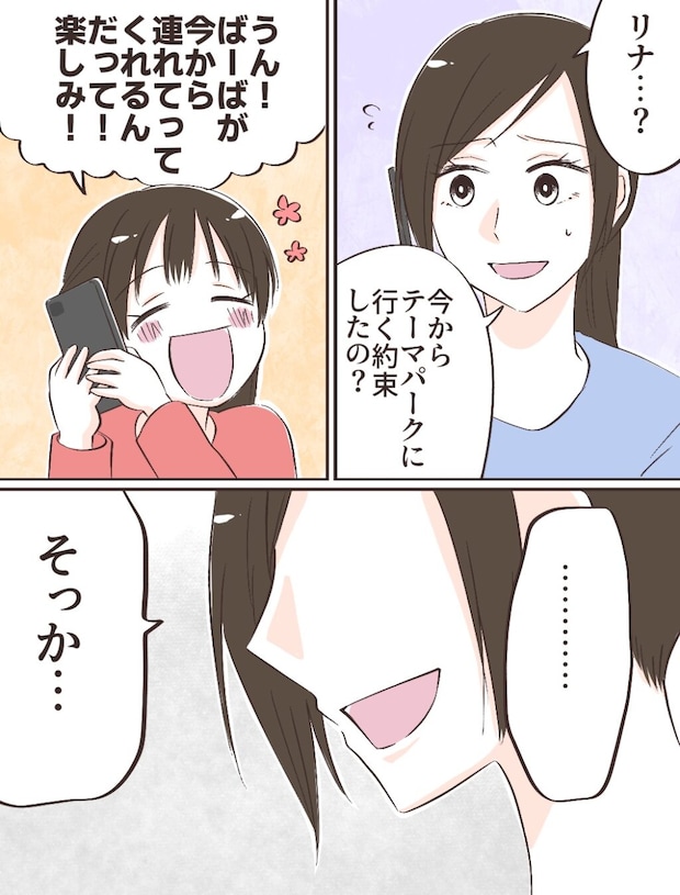 「リナ?今からテーマパークに行く約束したの?」恐る恐る問いかけると、「うん!ばーばが今から連れてってくれるんだって!」と嬉しそうな声で答えます。リナが行きたいなら、私は無理に止めることはできません。悲しい気持ちを抑えて「・・・そっか」と言いました。