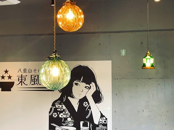 「八重山そば酒場 東風平」の店内は、コンクリ打ちっぱなしの令和らしいシンプルさと、琉球ガラスペンダントやシーサーが演出する島の温もりを掛け合わせた空間となっている。