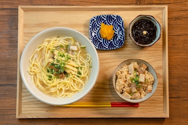 夜は、軟骨ソーキ・ラフティ・てびち・島素材のおつまみを中心に八重山そばの具材を“酒のあて”として楽しめる酒場スタイルで営業。夜の名物は「とろとろ炙り軟骨ソーキ」「沖縄前菜盛り合わせ」だ。