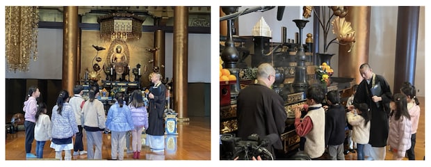 イベントはまず、増上寺の本堂での特別拝観からスタート。増上寺 當間 陽平(たいま ようへい)さんが、参加した子どもたちに平易な言葉で解説を行いました。子どもたちは真剣に耳を傾け、ご本尊の阿弥陀如来に見入ったり、貴重なお焼香体験をするなど、荘厳な空間で心を整える時間を過ごしました。