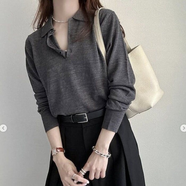 93_0920さんは「メリノポロセーター」を購入。細身だけど締めつけ感のない絶妙なシルエットで、上半身を華奢に見せてくれます。前ボタンを開けて肌見せすると、首元がすっきりとし、顔周りも明るくなること間違いなしっ♪ 若干光沢のある素材なので、華やかで上品な印象に!カジュアルにもオフィスシーンにも役立つ一枚です。