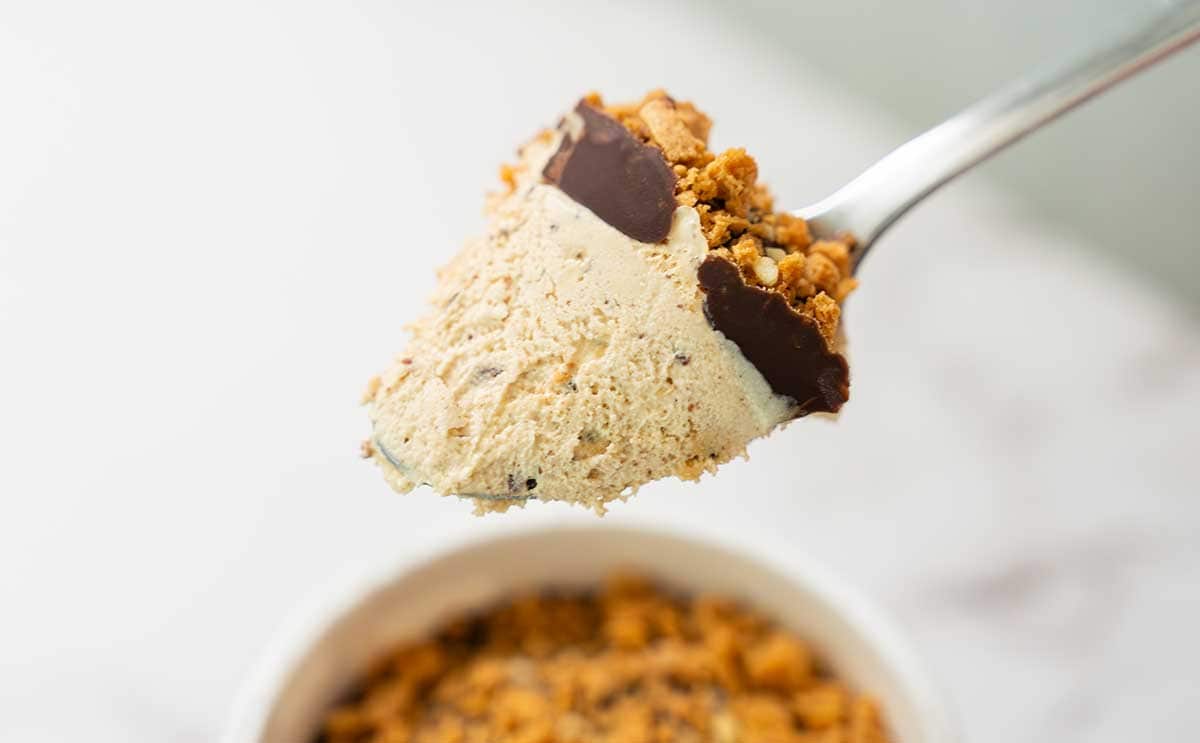 キャンディングアーモンドやバタークッキークランチなどが混ざっているアイスは、一口食べただけでも、パリパリ、ザクザク、カリカリとさまざまな食感を楽しめます。キャラメルの濃厚な味わいにチョコの華やかな風味が加わって本当においしいですね。