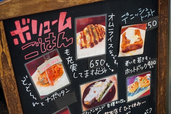 昼どきになると、店の表情がふっと変わる。黒板に書かれた「ハンバーグ」「ナポリタン」「オムライス」——どれも、見た瞬間に気持ちがゆるむような響きだ。