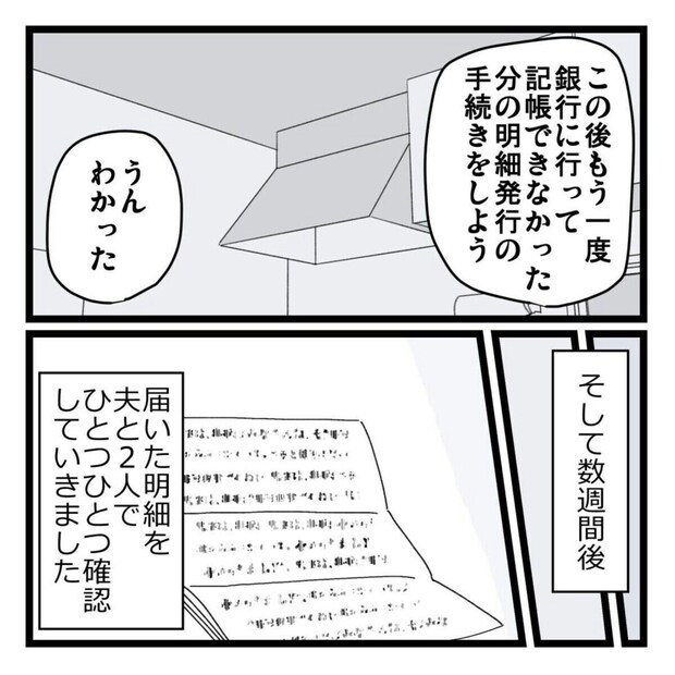 「銀行のお金が減ってる気がする」と義母から相談されたほぺ美さん夫婦。早速、銀行で通帳の記帳をします。すると、過去1年間で義母が受け取っていないお金があることが発覚します。