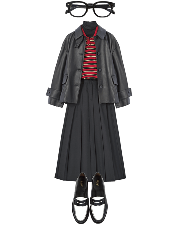 レザージャケット¥217,800(マッキントッシュ/マッキントッシュ 六本木ヒルズ店)、ポロニット¥30,800(キャバン/キャバン 丸の内店)、中に着たタートルネックニット¥51,700(シックススリーナインセブン/S&T)、スカート¥26,400(ジャーナル スタンダード レサージュ/ジャーナル スタンダード レサージュ 銀座店)、メガネ¥19,800(ザ ベッドフォード ホテル/キングスター)、ローファー¥34,100(ジーエイチバス/ジーエイチバス トウキョウ)