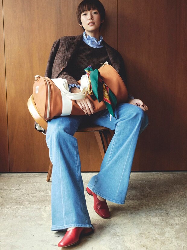 パンツ¥25,300、トートバッグ¥6,930(共にオブラダ/CINCH)、シャツ¥39,600(エイトン/エイトン青山)、中に着たタートルネックニット¥17,600(ハイク/ボウルズ)、首に巻いたスカーフ¥2,800(Long Beach OMOTESANDO)、バッグ¥51,700(プンティ/ショールーム セッション)、パンプス¥63,800(カチム)