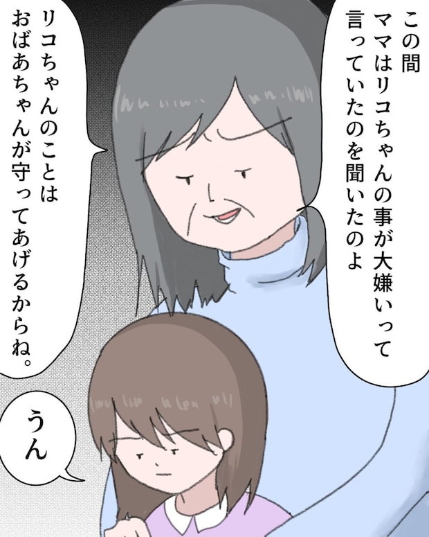 「この間、ママはリコちゃんのことが大嫌いって言っていたのよ、リコちゃんのことはおばあちゃんが守ってあげるからね」義母はリコの肩に手を置き、催眠術でもかけるかのように囁きます。幼いリコはその言葉を信じて、「うん」と素直に頷いてしまうのでした。