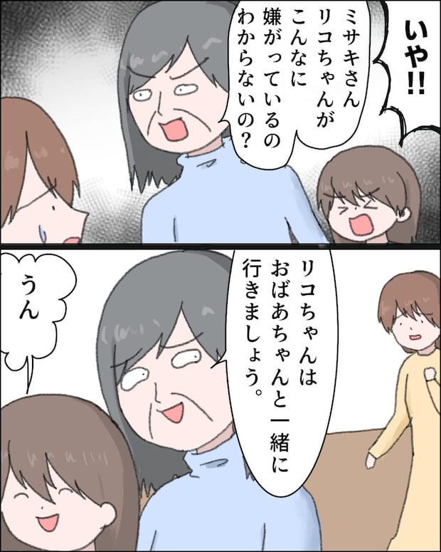 「いや!」リコは私を強く拒絶しました。すると義母が私たちの間に割って入り、「リコちゃんがこんなに嫌がっているのわからないの?」と責め立てます。実の娘に拒絶されたショックで言葉を失う私を、義母はあざ笑うかのような目で見下すと、そのままリコを連れて散歩に出かけていきました。