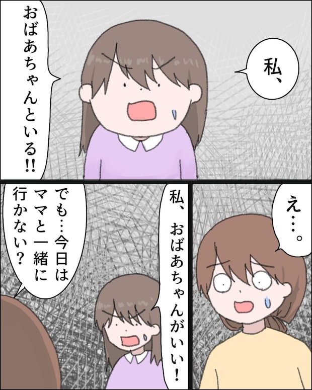 幼いリコは義母の言葉をそのまま信じ込み「私、おばあちゃんといる!」と、私と出かけるのを嫌がるようになりました。おばあちゃんがいいと必死に訴える姿に戸惑いながらも、「でも・・・今日はママと一緒に行かない?」とめげずに声をかけます。