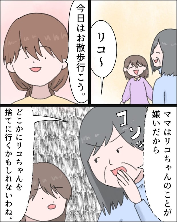 義母の策略で、母親である私よりも義母と過ごす時間がどんどん増えていったリコ。その影響で、リコはいつの間にか義母の言葉を疑いなく信じるようになっていました。ある日、散歩に行こうとリコを誘うと、義母はすかさずリコに「ママはリコちゃんのことが嫌いだから、どこかに捨てに行くかもしれないわね」と耳打ちします。