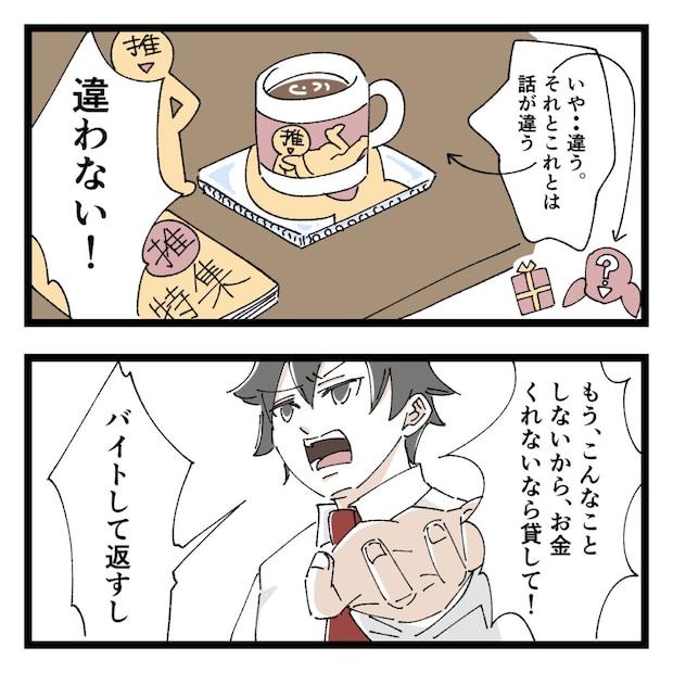 そして「いや・・違う。それとこれとは話が違う」と私がいい訳しようとすると、「違わない!」と即答。推しのマグカップに推しの写真集、推しに囲まれた生活をしている私にショウが痛いことを言う・・。そして、「もう、こんなことしないから、お金くれないなら貸して!バイトして返すし」と絶対にプレゼントを買う!という意志がみなぎるショウにそう言われ、