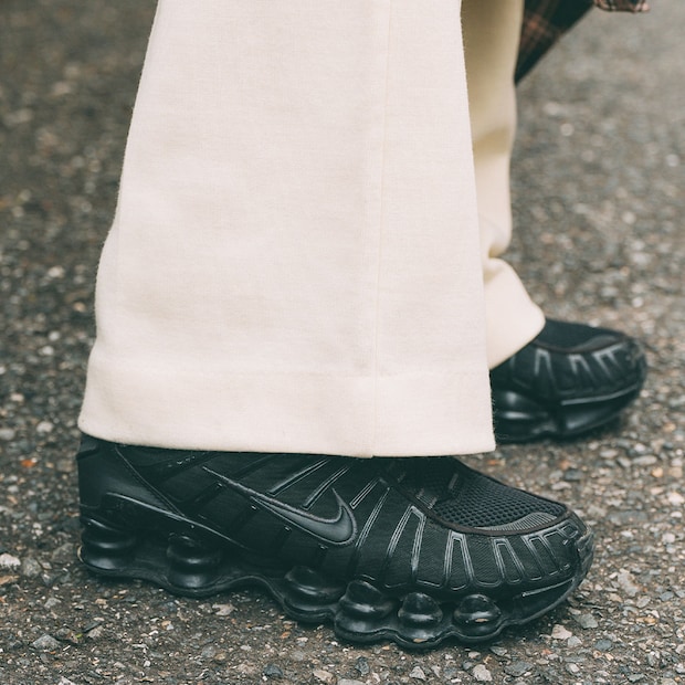 足元はトレンディなボリューム感ある『ナイキ』のスニーカーをオン! モードなデザインと歩きやすさも叶う優秀アイテム。