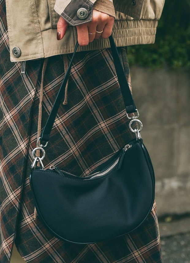 コーデを引き締めるのは『エディータ』のハーフムーンバッグ。ブラックをセレクトして、緊張感をプラス。