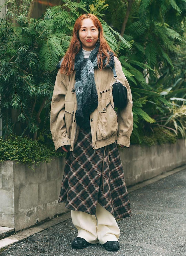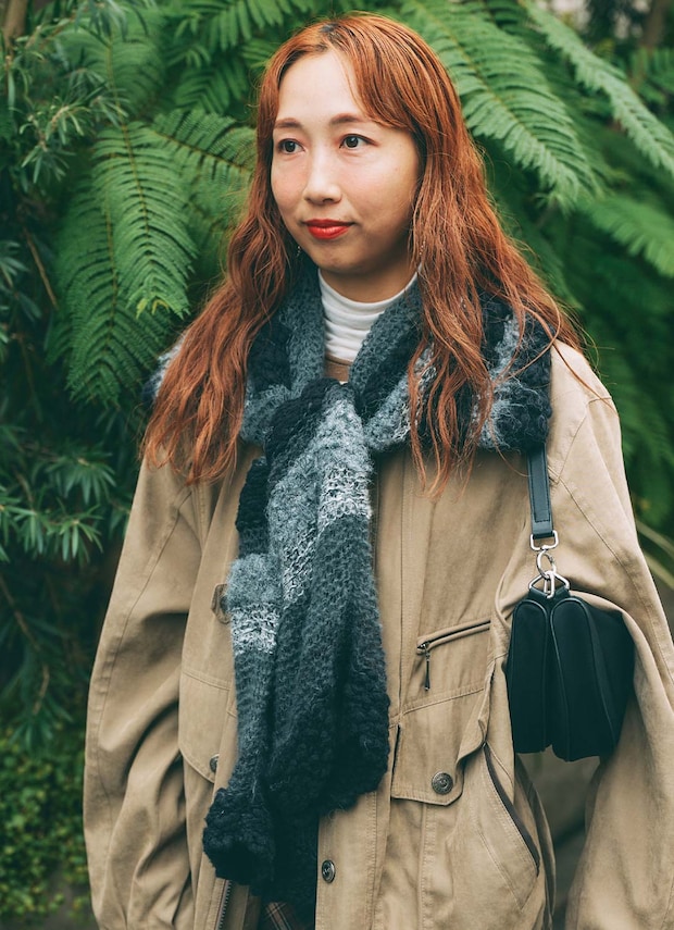 グレーのニットをマフラーのようにひと巻。ボーダーが好アクセントに、アレンジ術がきらりと光るスタイリング。