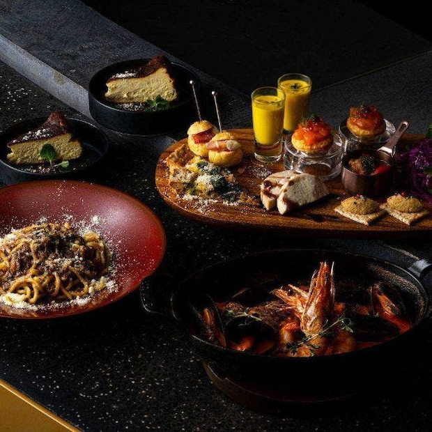 いくらとサーモンのタルト オシェトラキャビア添え/生ハムとクリームチーズのプチシュー/キャロットラぺ/紫キャベツのマリネ/美桜鶏のバロティーヌ/グリーンサラダ/ほうれん草のキッシュ/黒豚のリエット/農園野菜のラタトイユ/天使海老とオマール海老出汁のブイヤベース/天然酵母パン/浅草開化楼の生パスタを使った季節の〆パスタ/季節のデザート