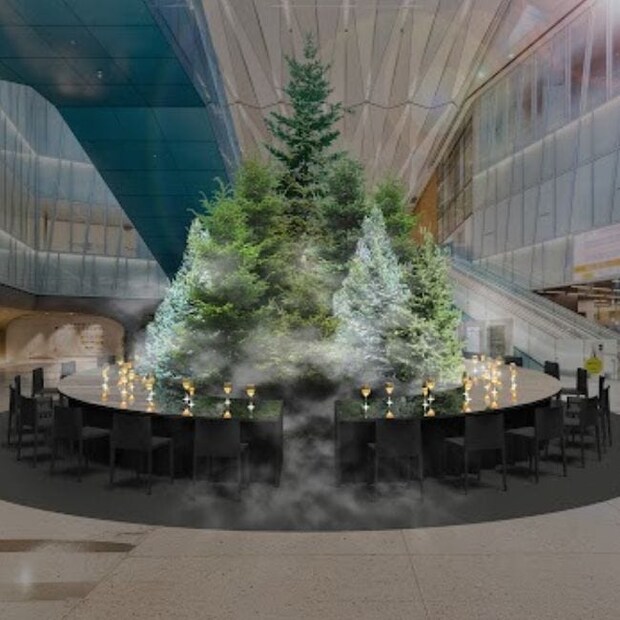 会場中央には、森を囲むようにダイニングテーブルを配置。訪れた人たちが集い、語らい、味わいながら過ごすクリスマスは、ここだけでしか味わえない体験。都会の喧騒を忘れるような、これまでにない感性に触れるクリスマスを楽しんで。