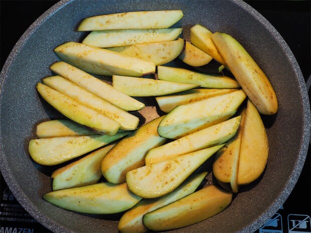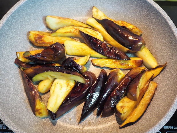 4. 3のなすを皮が下になるように並べ、中火で焼く。表面から油が吹き出したらひっくり返し、2面程焼き色をつける。しなっとして、皮の方がツヤツヤになるくらいを目安に焼いていく。