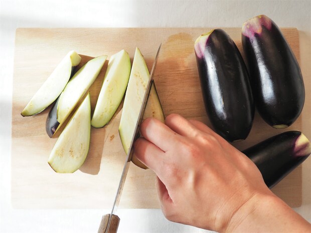 2. なすを食べやすい大きさに切る。