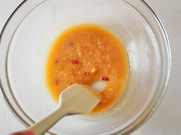 1. ボウルにみそ、酒大さじ2、鷹の爪を入れ、みそを溶くように混ぜ合わせる。