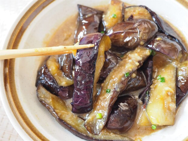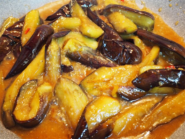 皮の紫色は部分的にキープ出来ている程度ですが、今までよりはきれいな色を保っているような気がします。身の部分も型崩れすることなく、とろっとろに仕上がりました。調味料や油のおいしさをなすがぎゅぎゅっと吸い込んでいて、口の中に入れるとじゅわ〜っとあふれ出します。普段作るものよりもとろっとろ&じゅわ~です!思わずにんまりしてしまうおいしさですね。
