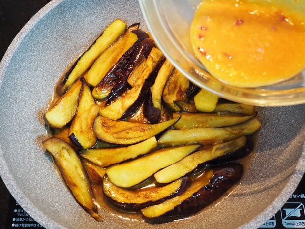 6. 火を少し弱め、5に1のみそダレを加え、なすにしっかり絡みとろっとしてくるまで混ぜ合わせる。